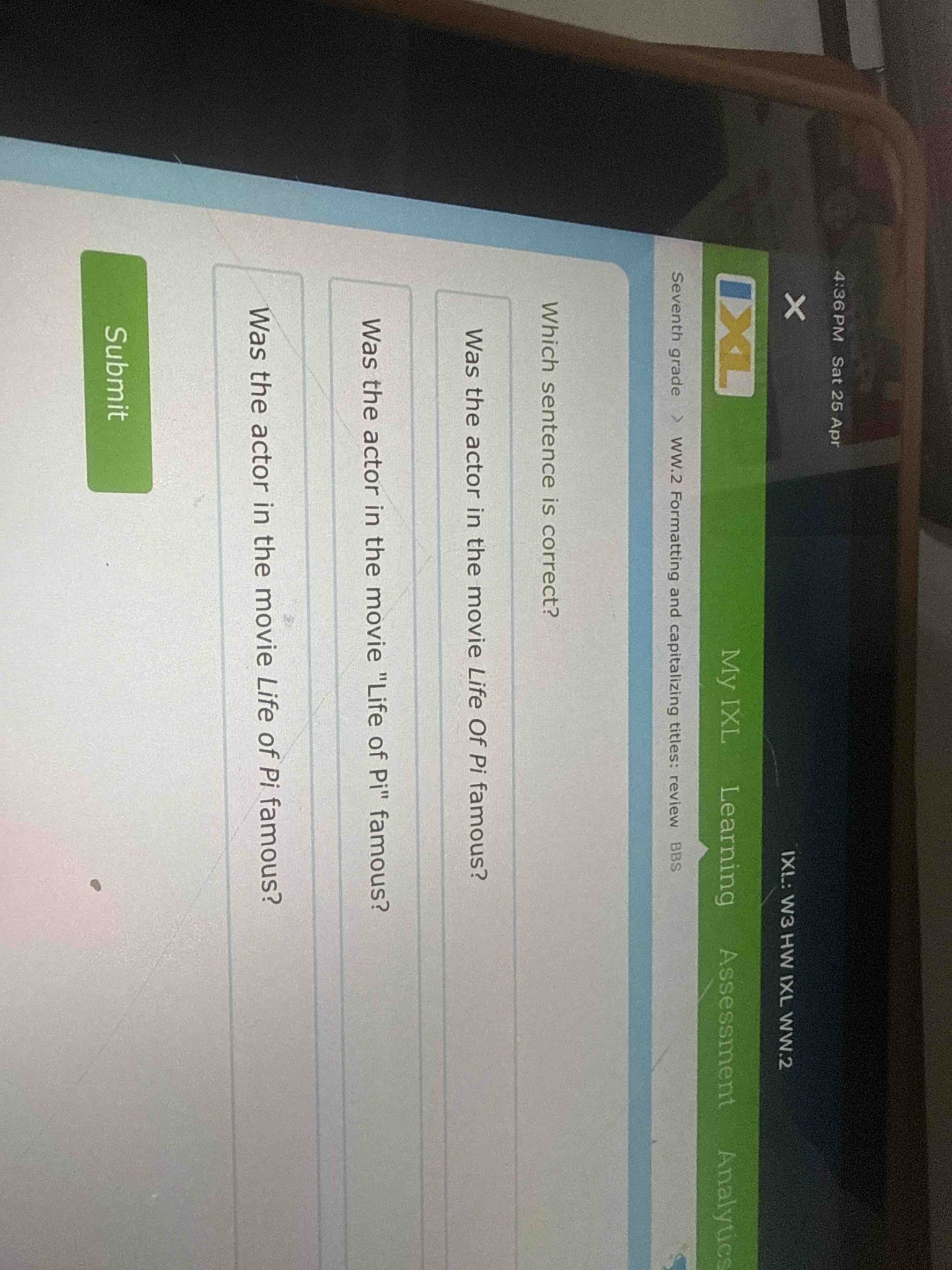 The correct answer is the first option: "Was the actor in the movie Life of Pi famous?" This is based on standard English formatting and capitalization rules for titles: 1. Formatting: In professional writing and academic styles (such as MLA or Chicago), titles of long works like movies, books, or albums should be italicized. Quotation marks are typically reserved for shorter works like articles, songs, or poems. Since the question is presented in a plain text interface, the italicized version (option 1) follows the rule that movie titles require italics, not quotation marks. 2. Capitalization: According to standard title case rules, the first and last words of a title are always capitalized. However, short prepositions (like 'of') and articles are generally not capitalized unless they are the first or last word. Therefore, 'Life of Pi' is the correct capitalization. The third option mistakenly capitalizes 'Of', which is incorrect.