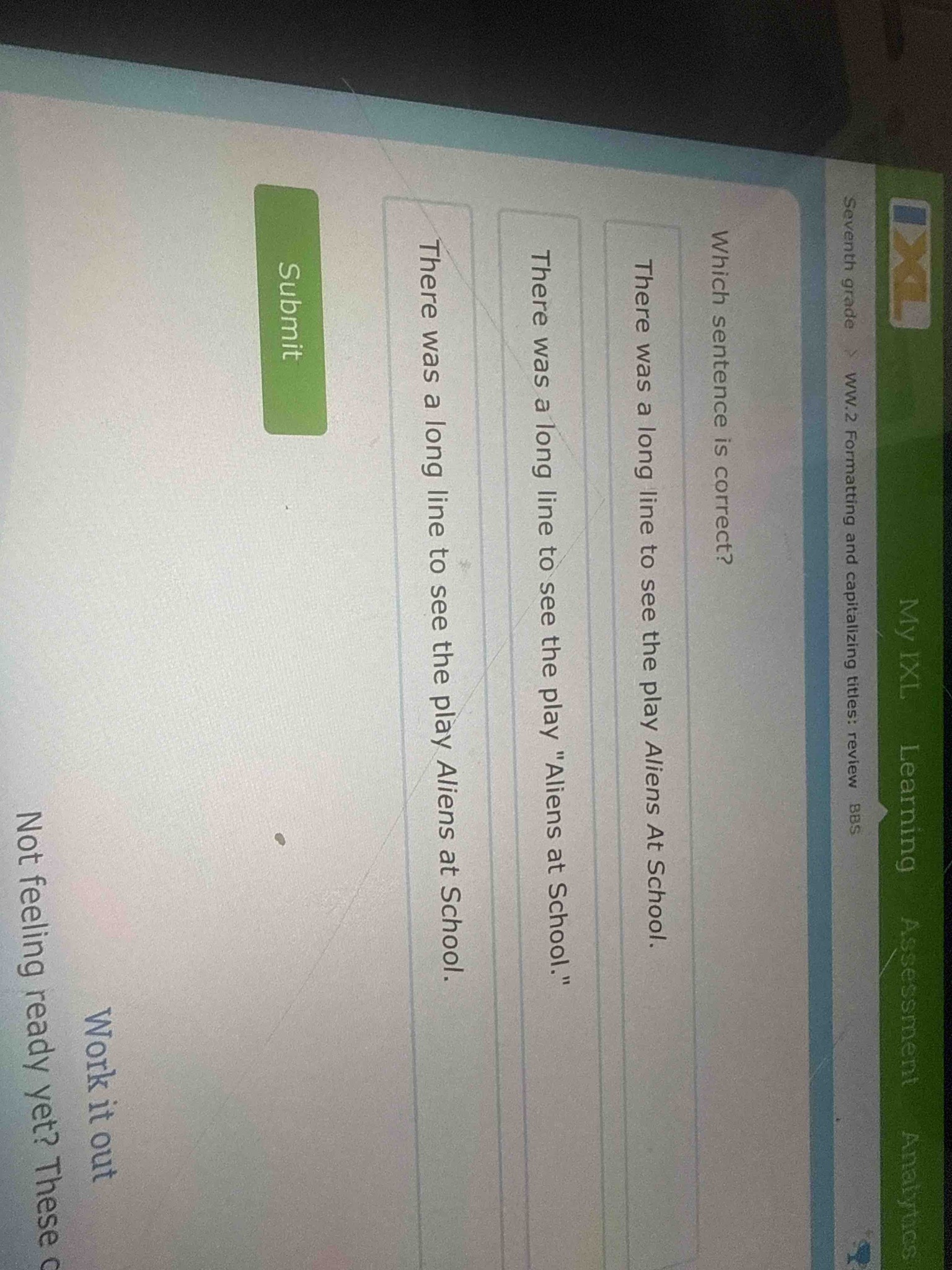 The correct sentence is: 'There was a long line to see the play Aliens at School.' (where 'Aliens at School' is italicized). Explanation: 1. Formatting Titles: According to standard style guides (like MLA or Chicago), titles of major works such as plays, movies, and books should be italicized. Short works like songs or poems are typically placed in quotation marks. Since 'Aliens at School' is a play, it should be italicized rather than put in quotes. 2. Capitalization: In title case, you capitalize the first and last words and all principal words (nouns, pronouns, verbs, adjectives, adverbs). However, you should not capitalize articles (a, an, the), prepositions (at, by, for, in, etc.), or coordinating conjunctions unless they are the first or last word of the title. Therefore, 'at' should remain lowercase. Applying these rules, 'Aliens at School' (italicized with 'at' in lowercase) is the grammatically correct choice.